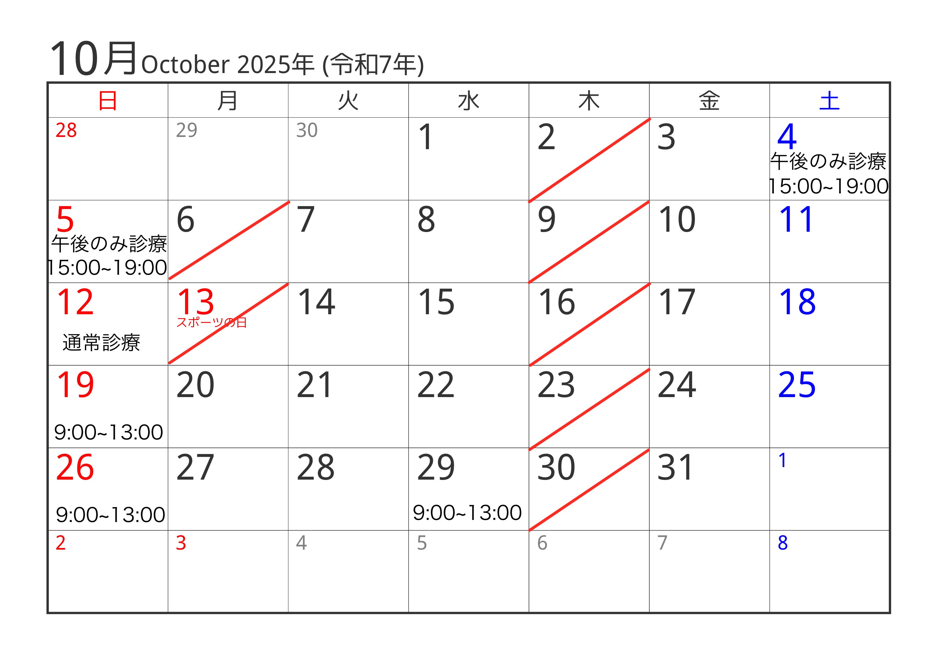 診療時間 | 月・火・水・金・土 9:00~13:00(昼休)15:00~19:00 日 9:00~15:00 木・祝休診 |